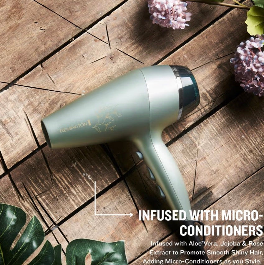 The Remington Botanicals Hairdryer uses Aloe Vera, Jojoba, and Rose Extract Micro-conditioners to enhance hair beauty. These botanical micro conditioners are released into the air to care for each strand as it dries. The hairdryer also features a BotaniCare setting for drying at a lower temperature, ensuring a salon-quality finish.